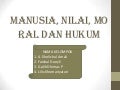 - Kaidah Moral 1. Hati Nurani merupakan fenomena moral yang sangat hakiki. • Hati nurani merupakan penghayatan tentang baik atau buruk mengenai perilaku manusia dan hati nurani 2. Kebebasan dan tanggung jawab. • Kebebasan adalah milik individu yang sangat hakiki dan manusiawi dan karena manusia pada dasarnya adalah makhluk bebas. Tetapi didalam kebebasan itu juga terbatas karena tidak boleh bersinggungan dengan kebebasan orang lain ketika mereka melakukan interaksi. 3. Nilai dan Norma Moral. • Nilai dan moral akan muncul ketika berada pada orang lain dan ia akan bergabung dengan nilai lain seperti agama, hukum, dan budaya. Nilai moral terkait dalam tanggung jawab seseorang.